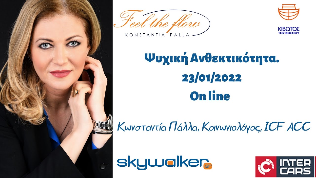 Η εταιρεία διοργάνωσης σεμιναρίων FEEL THE FLOW σε συνεργασία με τη SKYWALKER και την INTERCARS οργάνωσαν την Κυριακή, 23/1/2022 στις 18:00-20:00, μέσω zoom, σεμινάριο με θέμα την Ψυχική Ανθεκτικότητα, με ομιλήτρια την Κωνσταντία Πάλλα, Κοινωνιολόγος- ACC. Το σεμινάριο είχε φιλανθρωπικό σκοπό και με πολύ χαρά συνεισφέραμε στο τεράστιο έργο της Κιβωτού του Κόσμου.